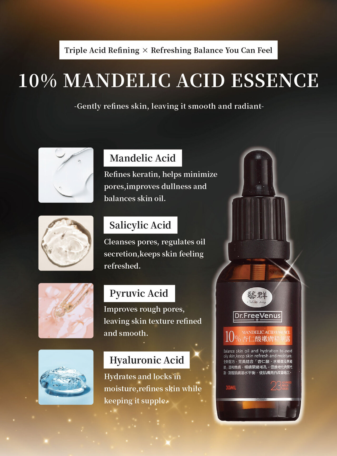 Oil Control | Tightens Pores | Combines 3 Acids“Mandelic Acid, Salicylic Acid, and Pyruvic Acid” to balance skin’s oil and moisture