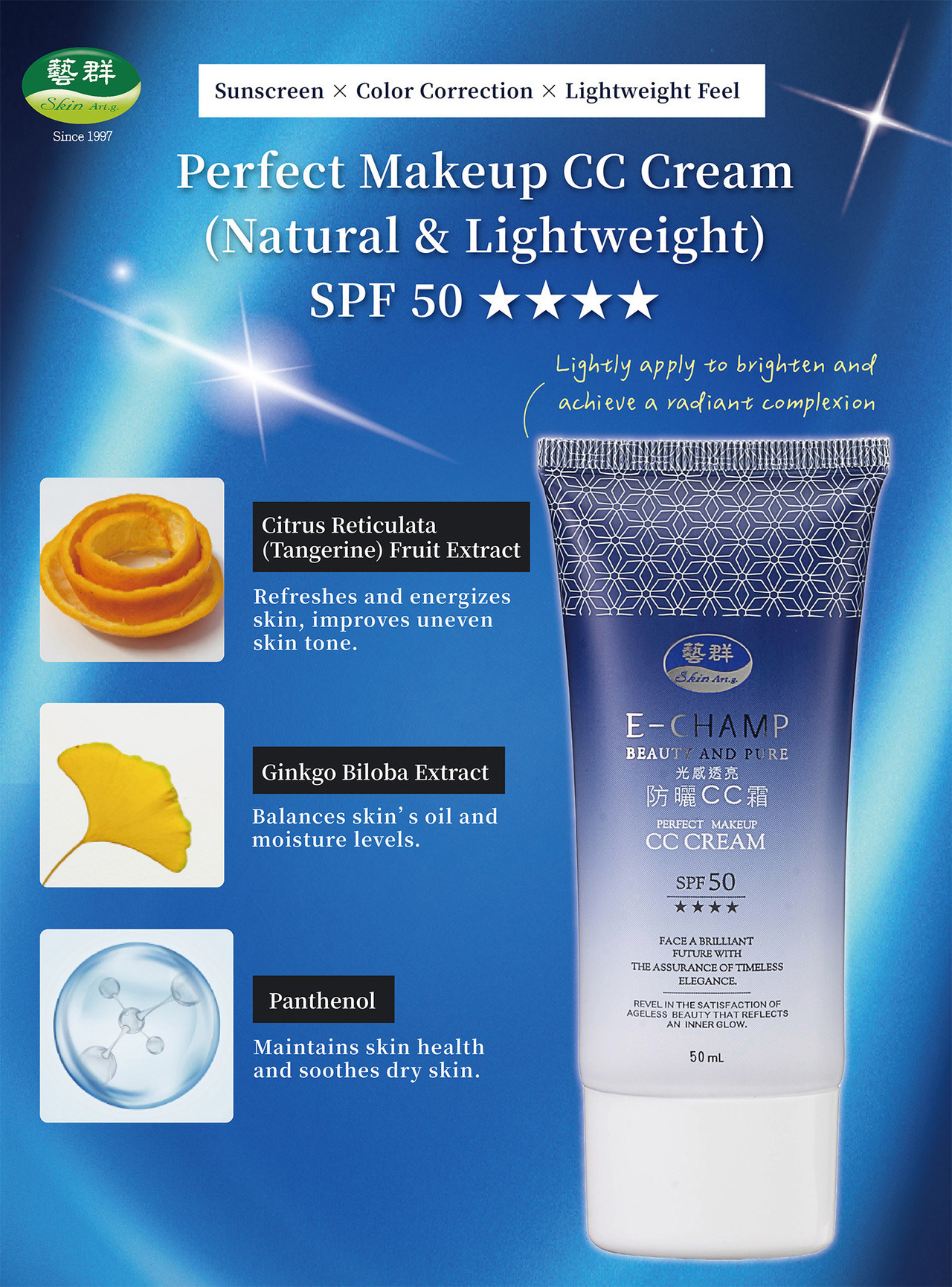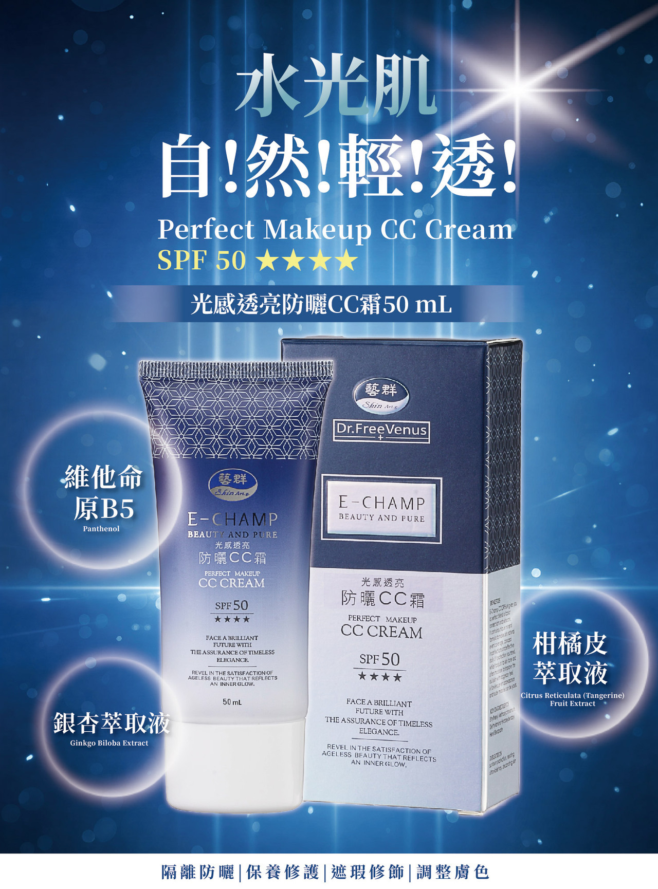 【Product Features】The "CC" stands for "Color correction + Care," offering functions of sunscreen, skincare, repair, concealing, and color adjustment. It provides deep hydration, improves dull skin, with a lightweight texture that offers excellent even tone and color-enhancing effects, delivering natural correction and beautification for flawless, natural bare skin.