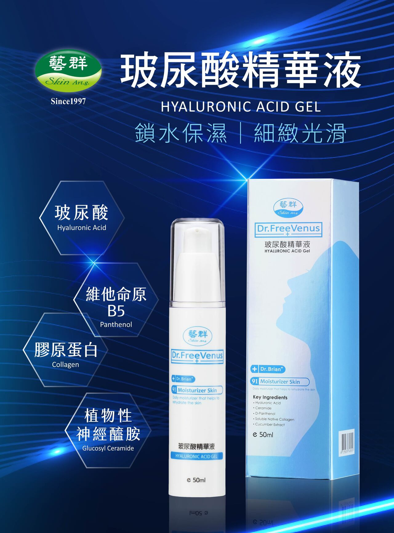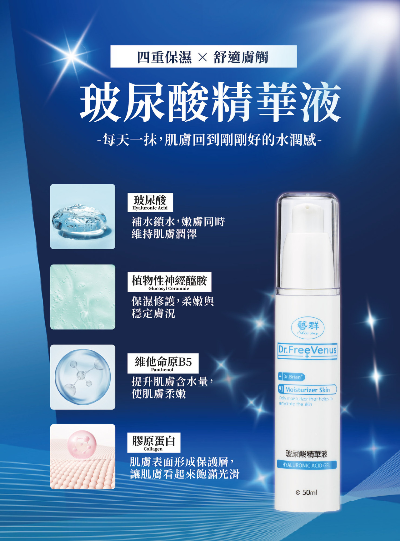 1.玻尿酸(Hyaluronic Acid):強大的保水因子,吸附並鎖住水分,使肌膚長時間保持潤澤改善肌膚粗糙。