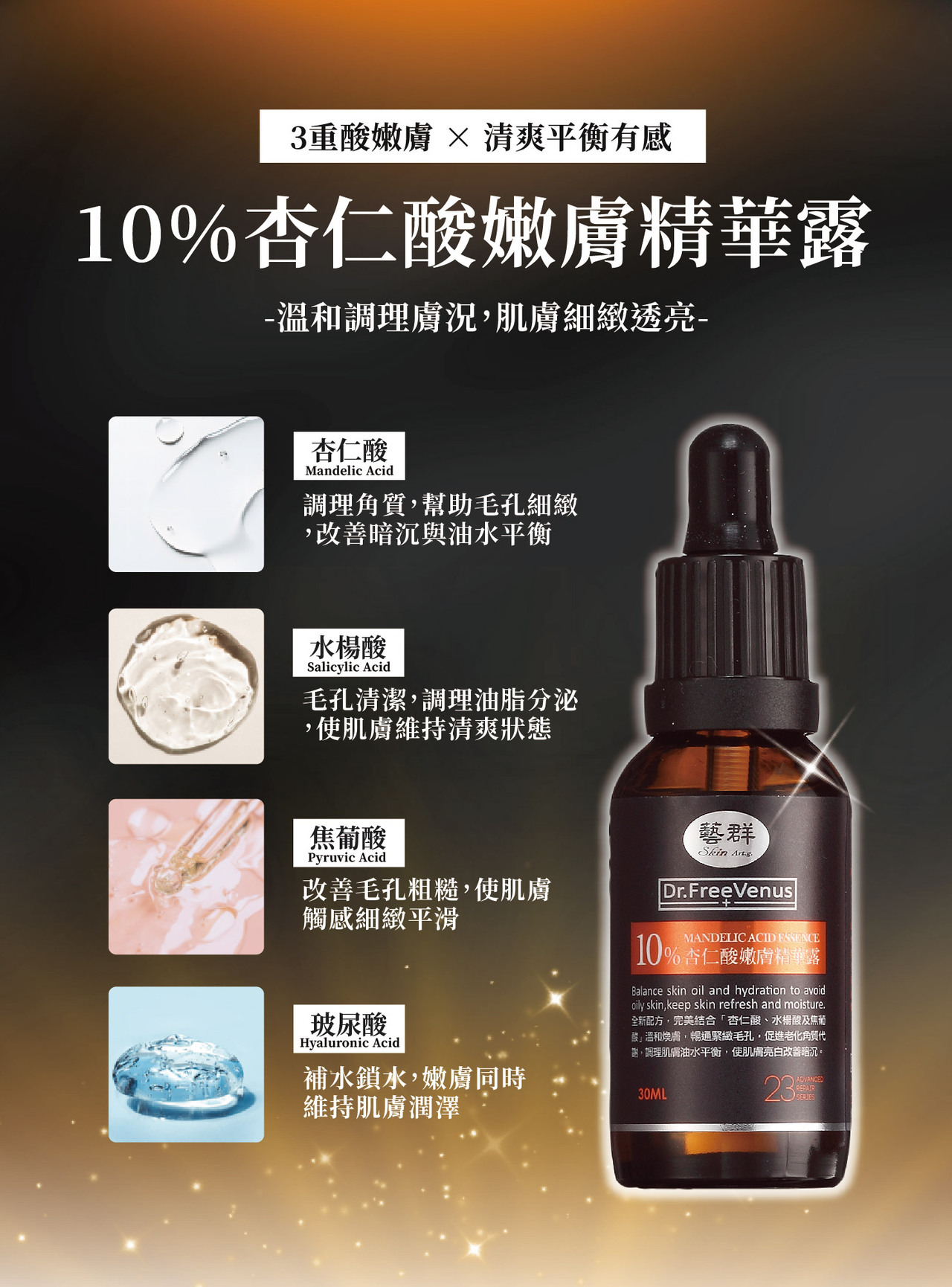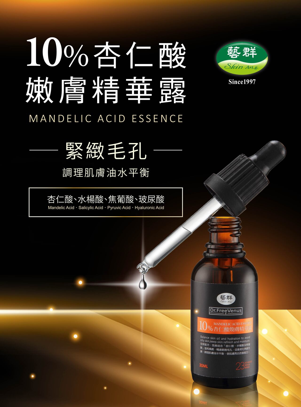 1.杏仁酸(Mandelic Acid):緊緻毛孔、調理肌膚油水平衡,改善暗沉現象。