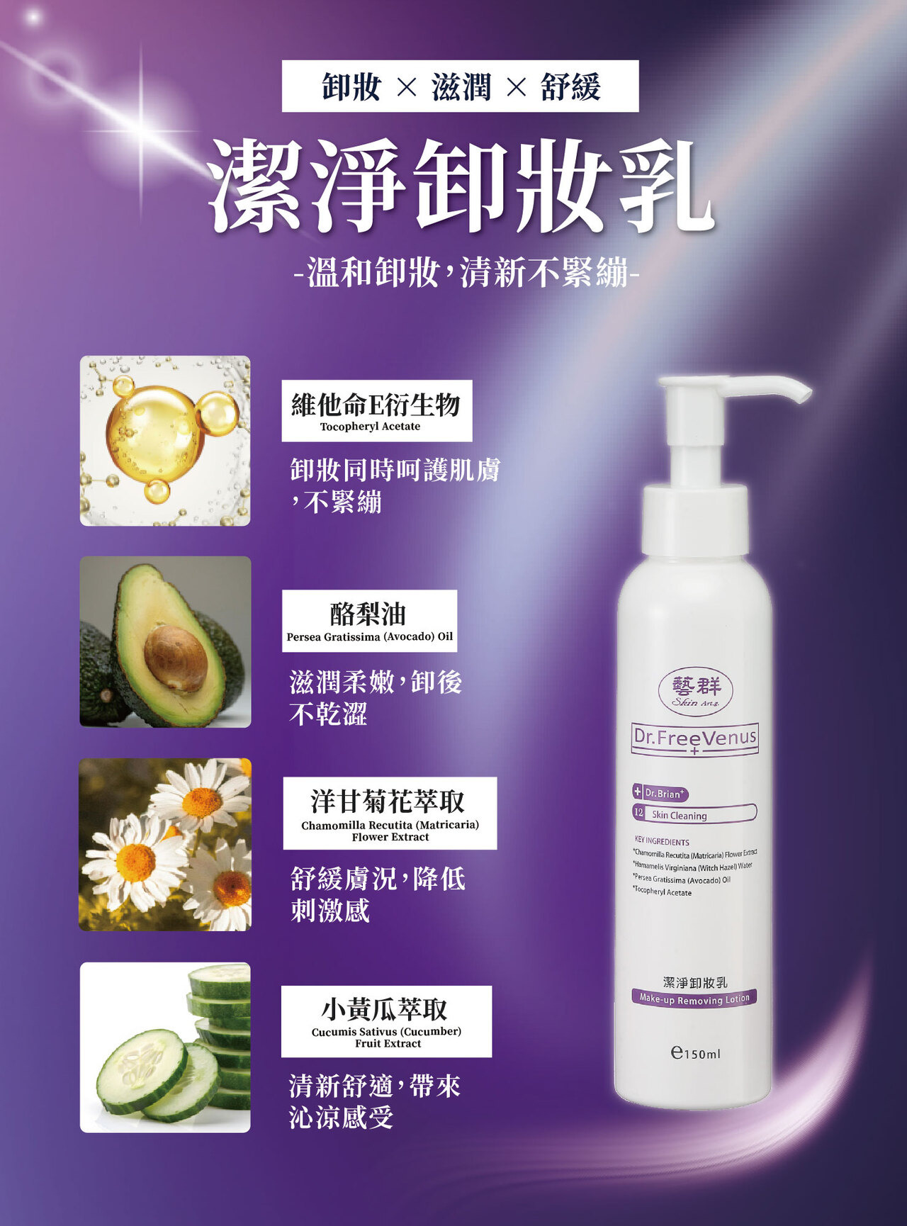 4.小黃瓜萃取(Cucumis Sativus (Cucumber) Fruit Extract):清新舒涼又鎮定,卸妝過程倍感舒適。