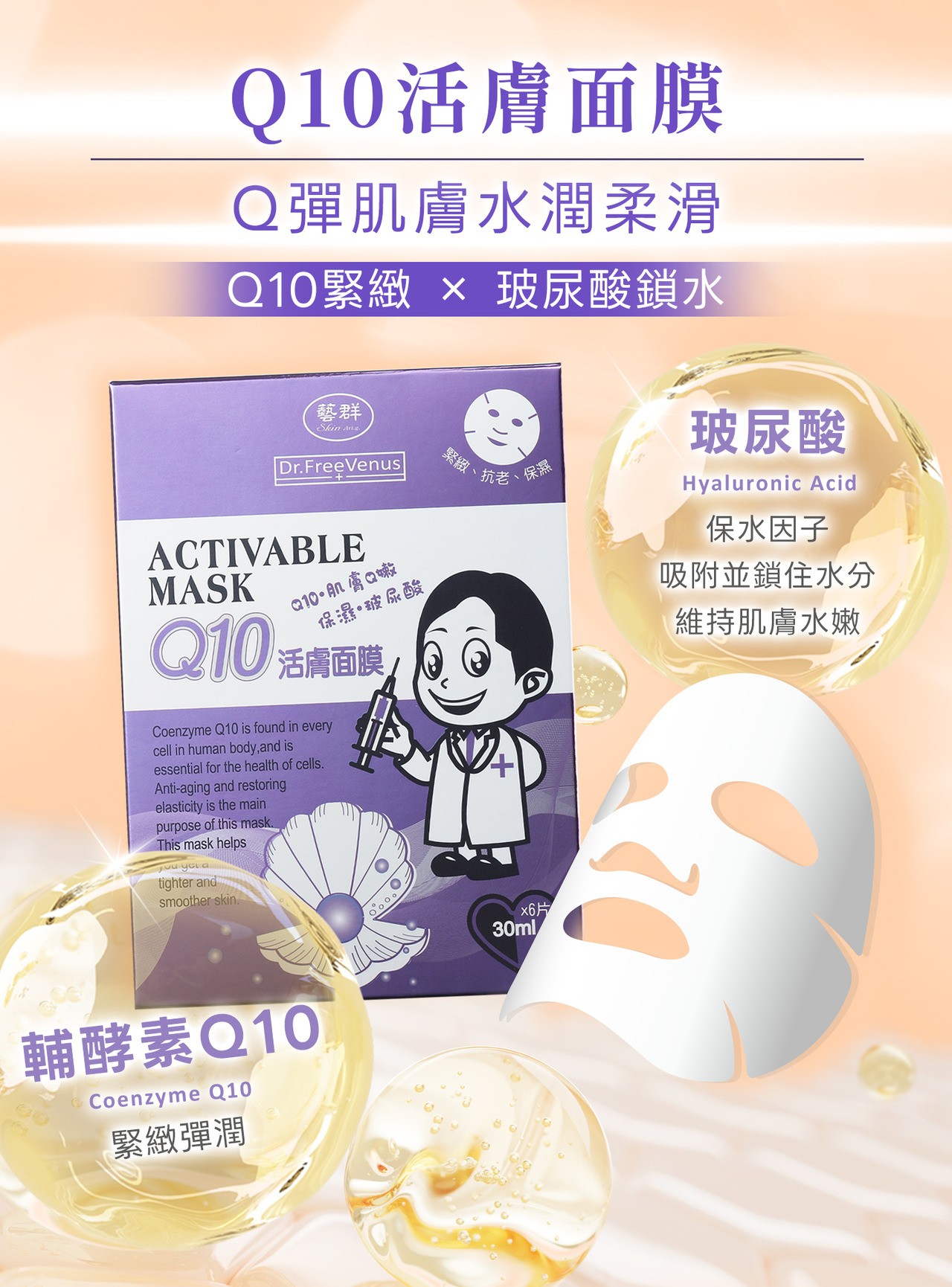 1.輔酵素Q10。 2.玻尿酸(Hyaluronic Acid) :強大的保水因子,吸附並鎖住水分,使肌膚長時間保持潤澤改善肌膚粗糙。